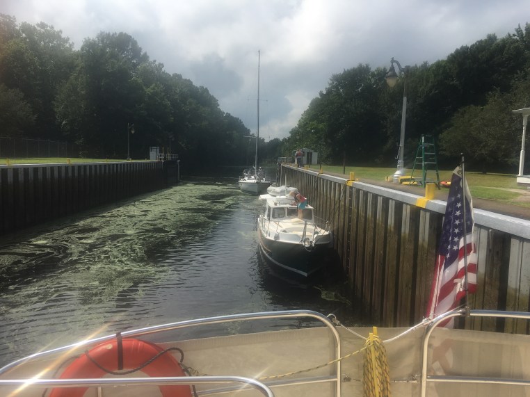 When we leave the South Mills Lock, we’ll be in the Dismal Swamp Canal. In the left of the picture you see the dreaded Duck Weed floating on the surface of the water. While we saw Duck Weed thru parts of the canal, when I checked the Slow Dance’s raw water strainers at the Welcome Center, very little of the Duck Weed was ingested into the raw water system.
