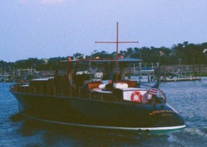Some things in life we never forget. I will never forget the time I saw Aphrodite cruising north on the ICW. According to the date on the two pictures that I took of her, it was Sunday, September 24, 2000. Not long before, I had read a story of her being found wasting away on a canal in Florida. As we cruised our restored Cargile Cutter, SunSmiles south on the ICW behind the Isle of Palms, SC, I saw what appeared to be a black-hulled boat approaching from the south. As the gap between us closed, I realized it was Aphrodite!