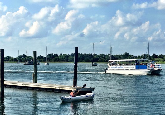 Since we would be leaving Beaufort early the day after her July 4th birthday, I gave Carolyn her birthday present – an inflatable kayak – early, so she could enjoy paddling Taylor’s Creek and over to the Rachel Carson Reserve across from the marina.