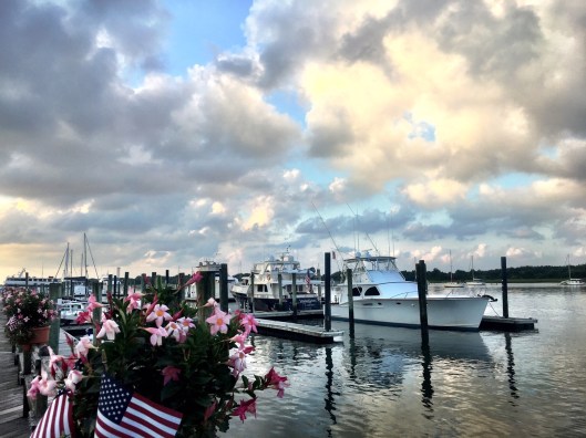 Beaufort Docks always has beautiful flowers on the fence above the bulkhead, but this year the American flags in each arrangement made them twice as beautiful.