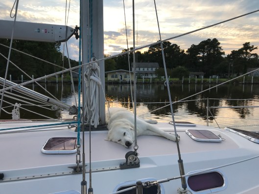 The marina is one long face dock that attracts some very big boats. Last night we docked behind the beautiful, 128’ Lady Kath. In front of Lady Kath was a beautiful vintage Hatteras, and a beautifully refitted Berger, home port Newport, RI. We have seen some amazing boats on this trip. More importantly, we’ve met some wonderful people — and Kate has made some new “fur-friends.”