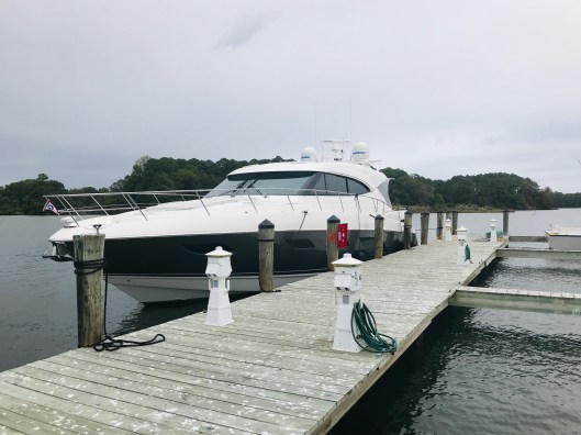 Today the couple on the sailboat that had been docked behind us left before sunrise, heading north in hopes of getting home off the Patuxant River. They texted us once on the Bay to let us know that conditions on the Bay were really rough and the lower Potomac had been even worse! At 1:04PM we received a text that they were finally safe at their home port. During their trip they saw only two big power boats and one sailboat. I sent her pictures of the two shown below, and asked if these were the two they saw. Her one word reply was, “Yes!”