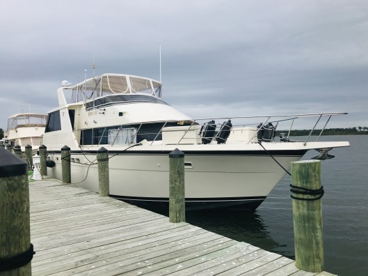 The big Hatteras cockpit motoryacht left Solomons Island this morning. Just a few miles south of Solomons the conditions got so bad their dinghy — secured on the flybridge — bounced off the boat, and a tv came off its wall mount. In the winds and 5-7 foot wave conditions, it took an hour to save and secure the dinghy to tow behind them.