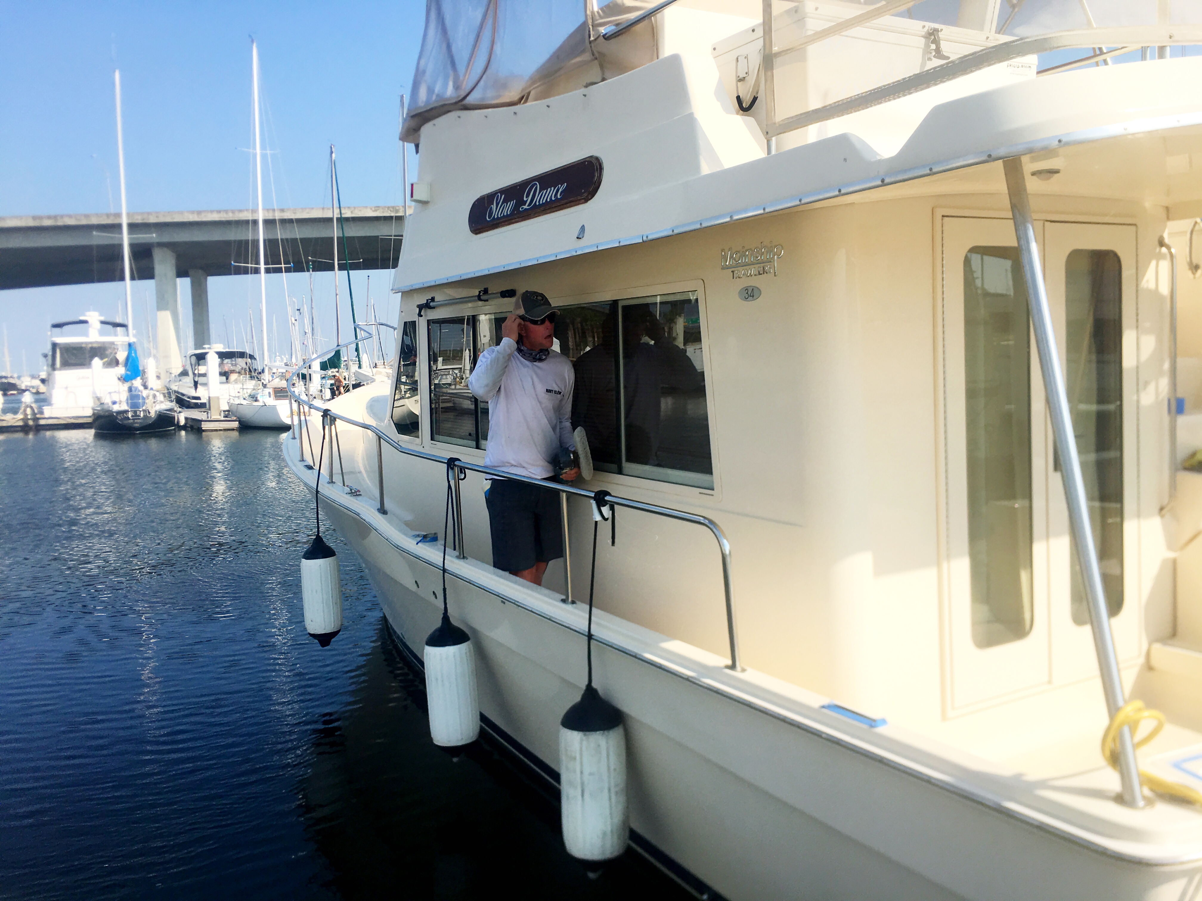 What separates David from the vast majority of other detailers?  He’s the consummate professional.  He hired a local young woman to polish the bright work, but David personally compounded, polished, and then waxed the boat — a time consuming three part process that left Slow Dance looking like it just came off a showroom floor.  And he literally detailed every square inch of the exterior, minus the canvas and Eisenglas, which are in need of replacement.  He cleaned and polished everything on the upper helm — which other detailers have ignored.  The biggest shock came when he called to ask about turning off power to the boat.  When I asked why, I was told he needed to defrost the large freezer on the upper helm so that he could clean and wax it — not done by previous detailers.  On a visit to the boat, his helper was cleaning shore power cords, the freshwater hose, all eight large fenders — again, not done by previous detailers.  After he finally finished detailing Slow Dance, he thoroughly washed and dried her.